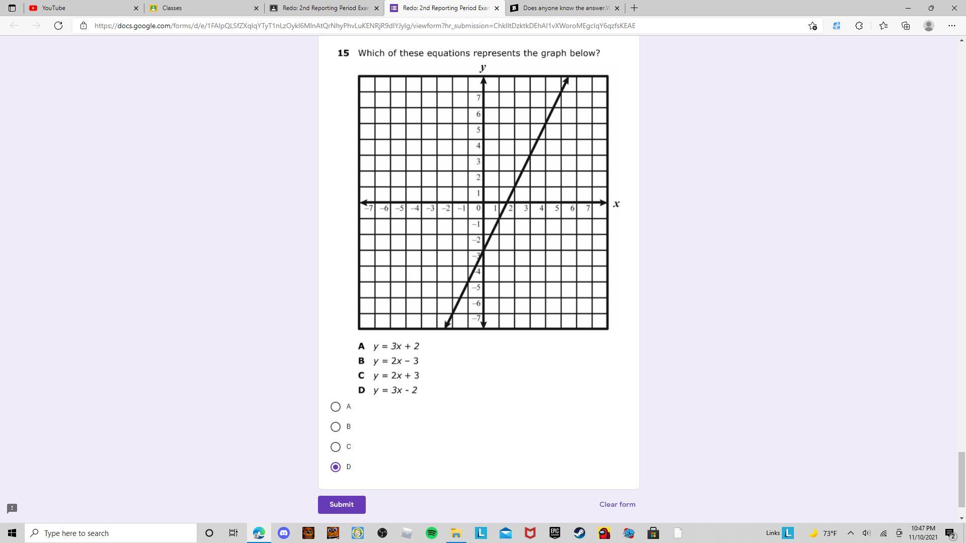 For A, our y-intercept is (0, 2). For B, our y-intercept is (0, -3). For C, our y-intercept is (0, 3). For D, our y-intercept is (0, -2). So which one matches our line? It would be B, since both have a y-intercept of (0, -3).