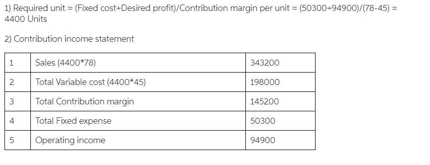 2. Check your answer by preparing a contribution margin income statement based on the number of units calculated. Refer to the list of Amount Descriptions for the exact wording of text items within your income statement.