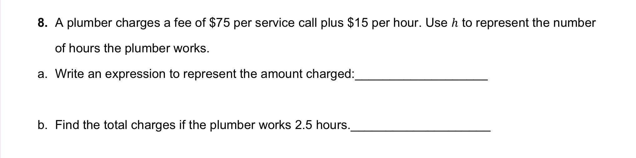 A: we have $75, $15, and h (which is equal to hour spent). We have a keyword which is plus. So we add the 75+15, since we do not know the amount of hours he/she is doing then we put that as h. per is another keyword for multiplication. so we end up with 75+15*h.