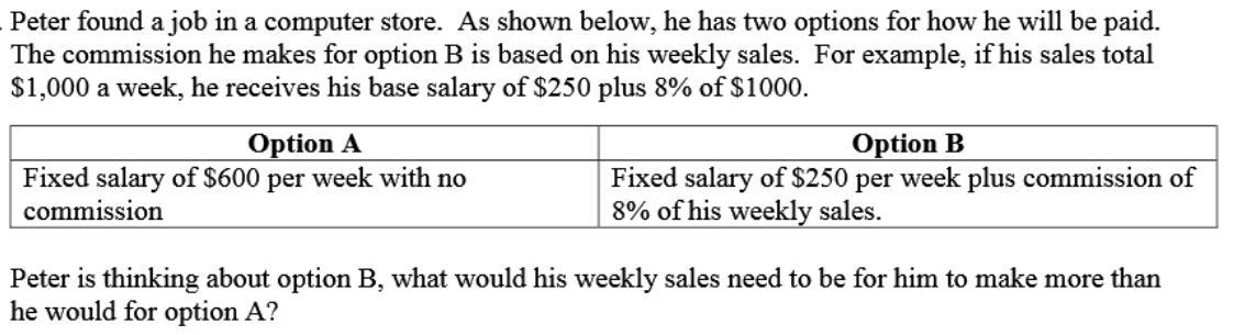 For option A) he will have fixed salary of $600 per week with no commission. What would his weekly sales need to be for him to make more than he would for Option A. (Picture is attached)