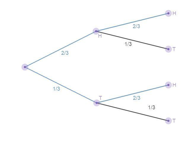 Thus, the probabilities on each branch are shown in the tree diagram, and P(HT) = 2/9.