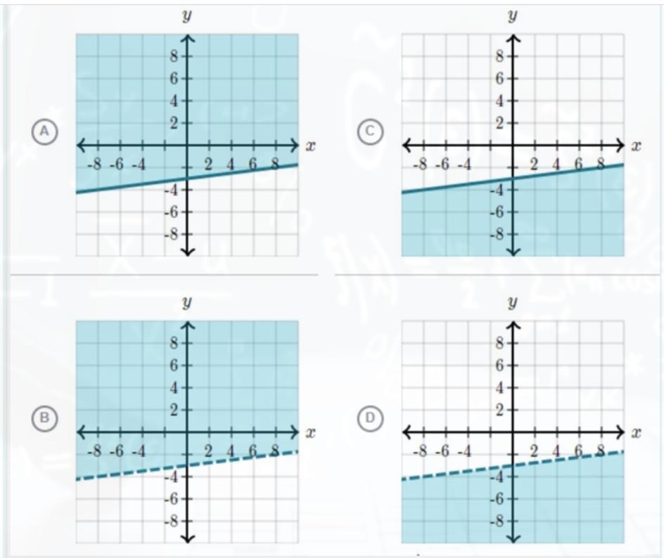 You can already rule out answers A and C, since they both contain the line, and we're not interested in these points. The easiest way to check is to plug the origin in the inequality and see if you get something true.