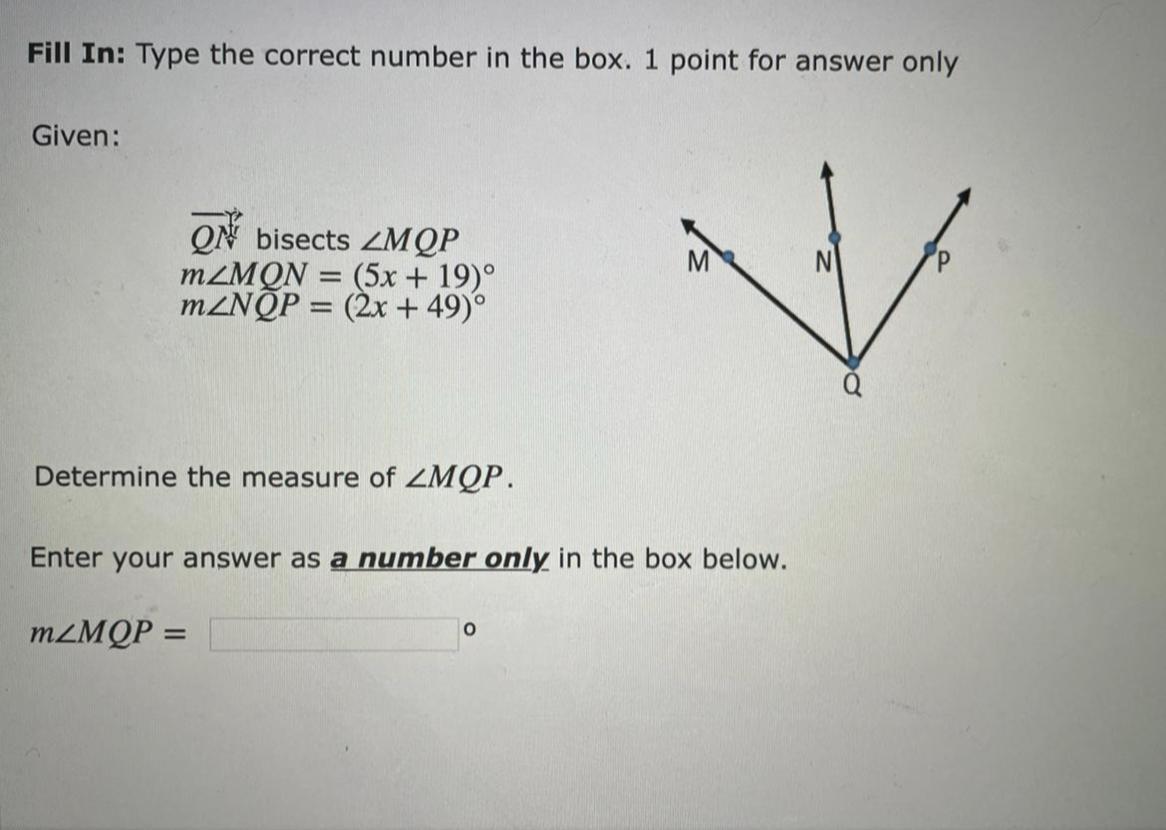 Substitute that x value (10) into the original equations in place of x for each angle to get MQN = 69 and NQP = 69
