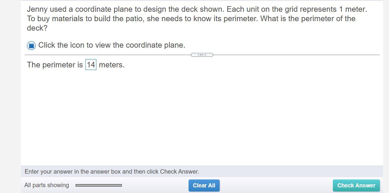 jenny used a coordinate plane to design the deck shown. each unit on the grid represents 1 meter. to buy materials to build the​