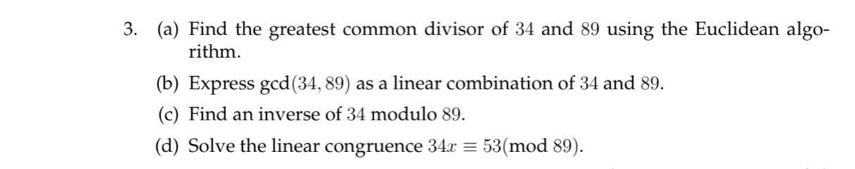 a. We have GCD(34, 89) = 1; using the Euclidean algorithm,