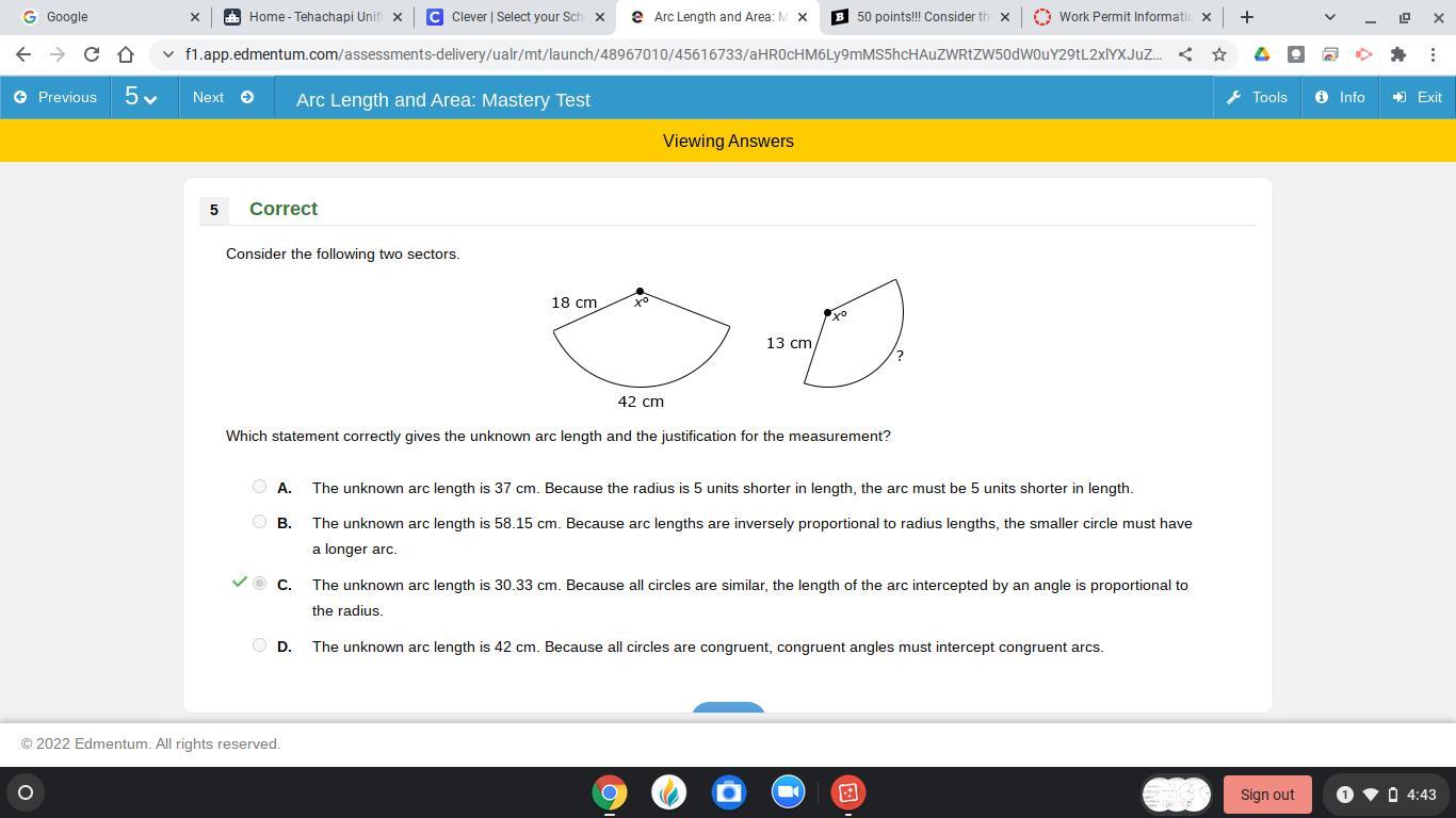 C: The unknown arc length is 30.33 cm because all circles are similar the length of the arc intercepted by an angle is proportional to the radius