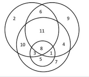 30 for the top left circle, 39 for the top right circle, 49 for the big one in the middle, and 17 for the small one in the middle. :)