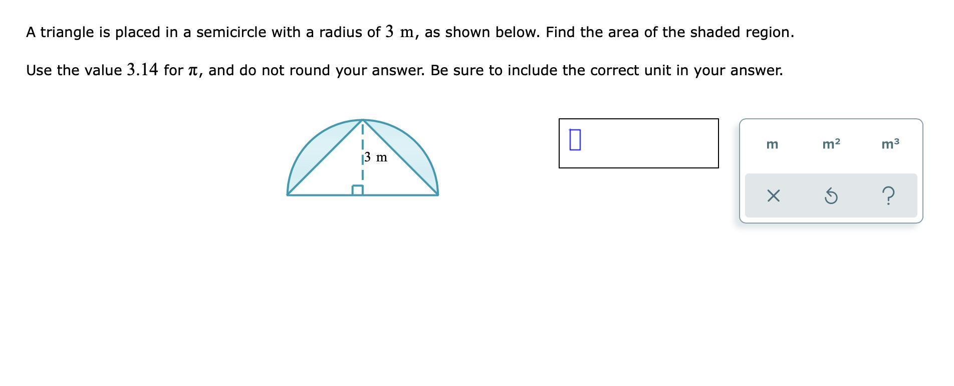 A triangle is placed in a semicircle with a radius of 3 yd, as shown below. Find the area of the shaded region.