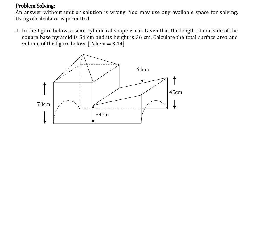 From this we take <u>half</u> a cylinder of radius 27 tall as the whole structure is long. \frac12 \pi r^2h = \frac12 \pi (27)^2(60+54) = 130,476.42 cm^3