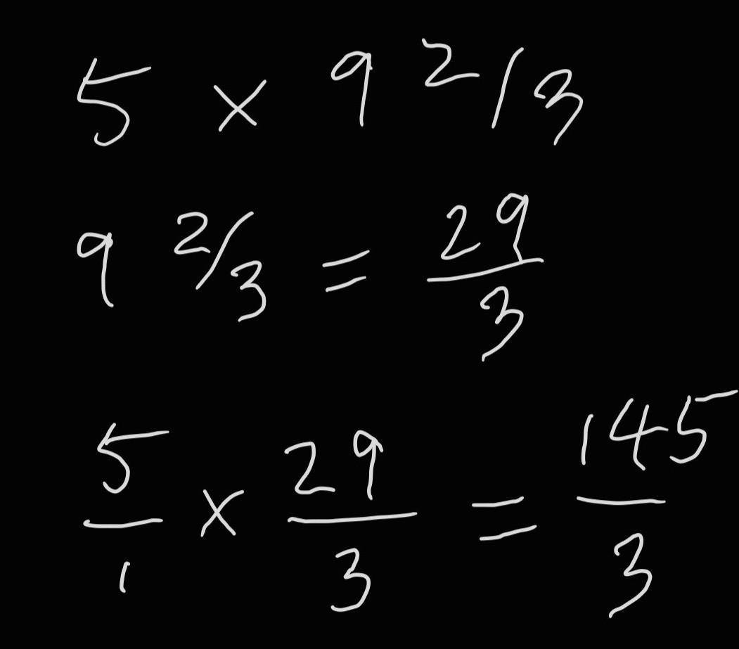 Each size 8 shoe measures 9 2/3 inches. If we line 5 of them together, the length of the entire thing will be 5 times the size of each shoe, 9 2/3 in. To write 5 as a fraction, put it over a denominator of 1. Then rewrite 9 2/3 as an improper fraction. Now you can multiply across and simplify as needed.