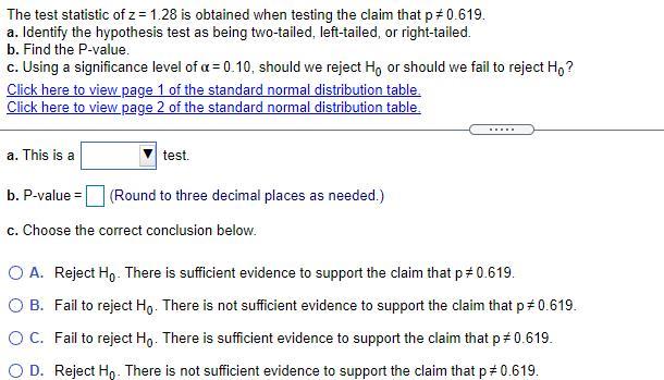 I'm Professor Curtis of Aspire Mountain Academy here with more statistics homework help. Today we're going to learn how to use a z-score to complete hypothesis testing for a claim of inequality. Here’s our problem statement: The test statistic of z = 1.25 is obtained when testing the claim that p does not equal 0.2978. A: Identify the hypothesis test as being two-tailed, left tailed, or right tailed. B: Find the P-value. C: Using a significance level of alpha equals 10%, should we reject H-naught, or should we fail to reject H-naught?