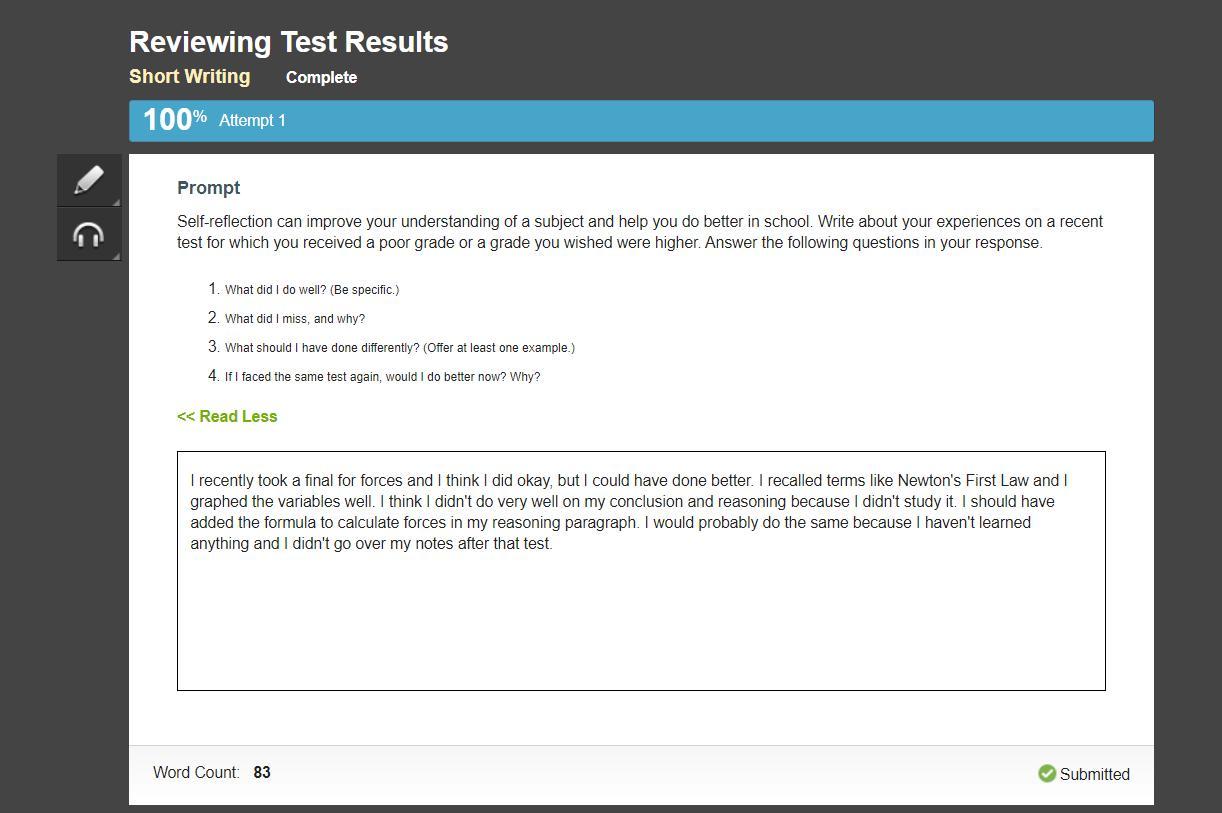I recently took a final for forces and I think I did okay, but I could have done better. I recalled terms like Newton's First Law and I graphed the variables well. I think I didn't do very well on my conclusion and reasoning because I didn't study it. I should have added the formula to calculate forces in my reasoning paragraph. I would probably do the same because I haven't learned anything and I didn't go over my notes after that test.