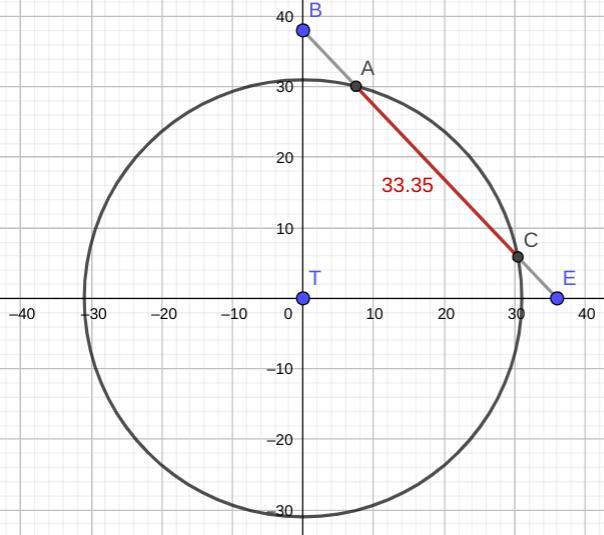 The hint suggests that we find the points where the drive begins and ends picking up the transmitter. We suspect both of those points will have irrational coordinates, so finding the distance between them will involve dealing with squares and roots of irrational numbers. We want to see if there's an easier way.