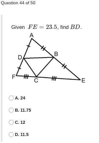 The triangle AFE has it's by the mid segment as BD ;as B is the mid-point of line EA ; and D is the mid-point of line FA ;