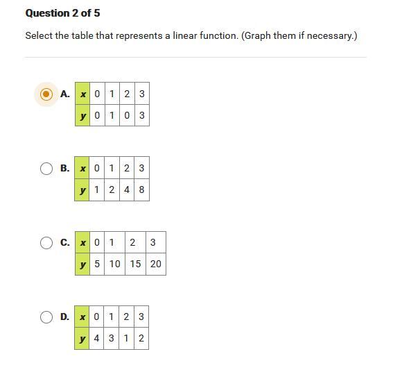 C bc the x is increasing by ones, while the y is increasing by 5’s