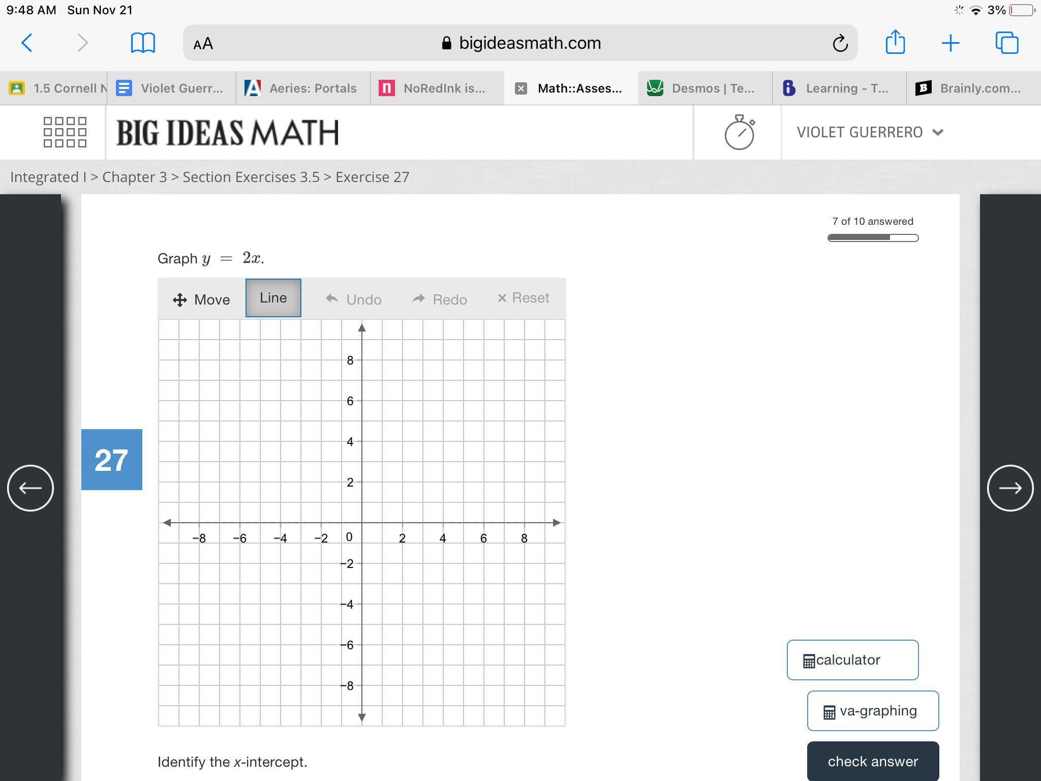 Make a table of points for y = 2x, and then plot these points, and finallyl draw a line through the points: