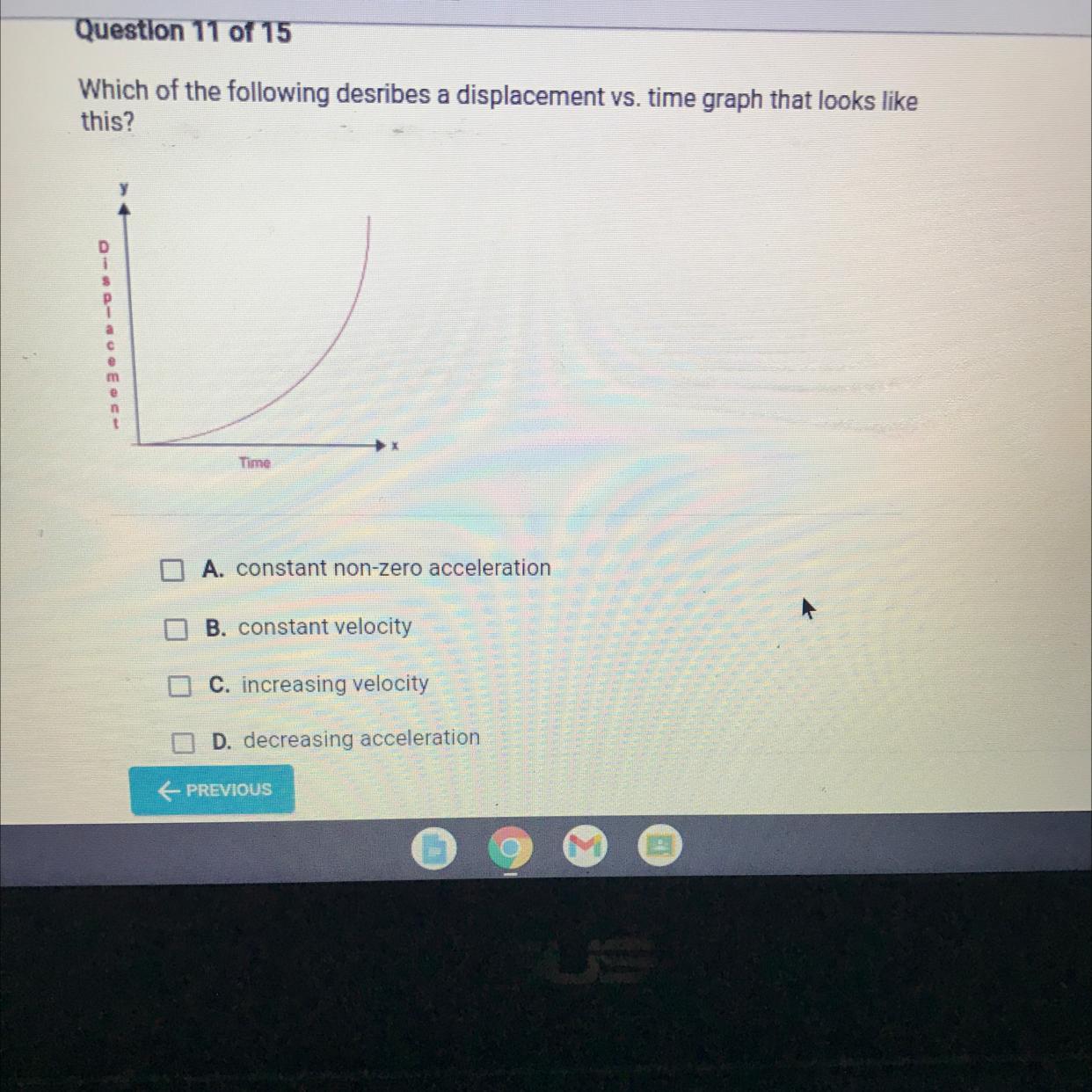 Which of the following desribes a displacement vs. time graph that looks like this?