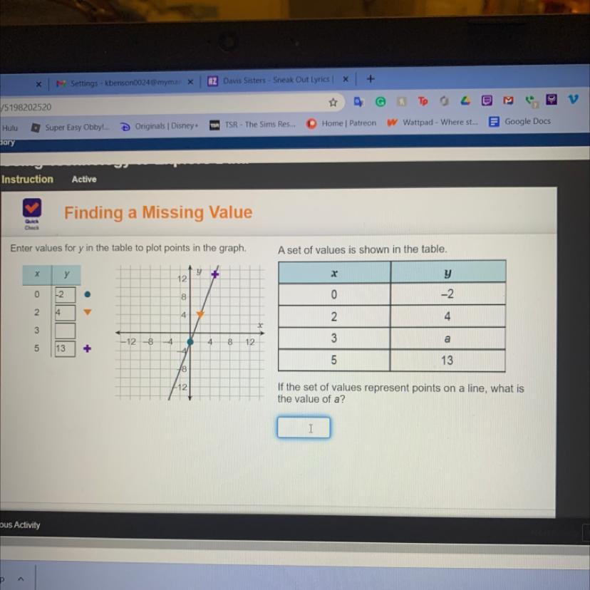 If the set of values represent points on a line, what is the value of a?