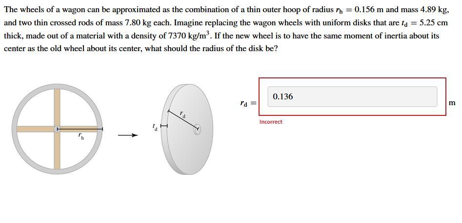 The radius of the disk of the <u>new wheels</u> should be 0.142 m. It was calculated from the moment of inertia of the <u>old wheels</u>, which is a combination of a thin outer hoop (<em>radius </em>= 0.156 m and <em>mass </em>= 4.89 kg) and two thin crossed rods (<em>mass </em>= 7.80 kg each one), and from the density (7370 kg/m³) and thickness (5.25 cm) of the <em>disk</em>.