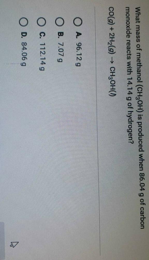 Therefore, 86.04 g of CO will react to produce = (86.04 x 32)/28 = 98.33 g