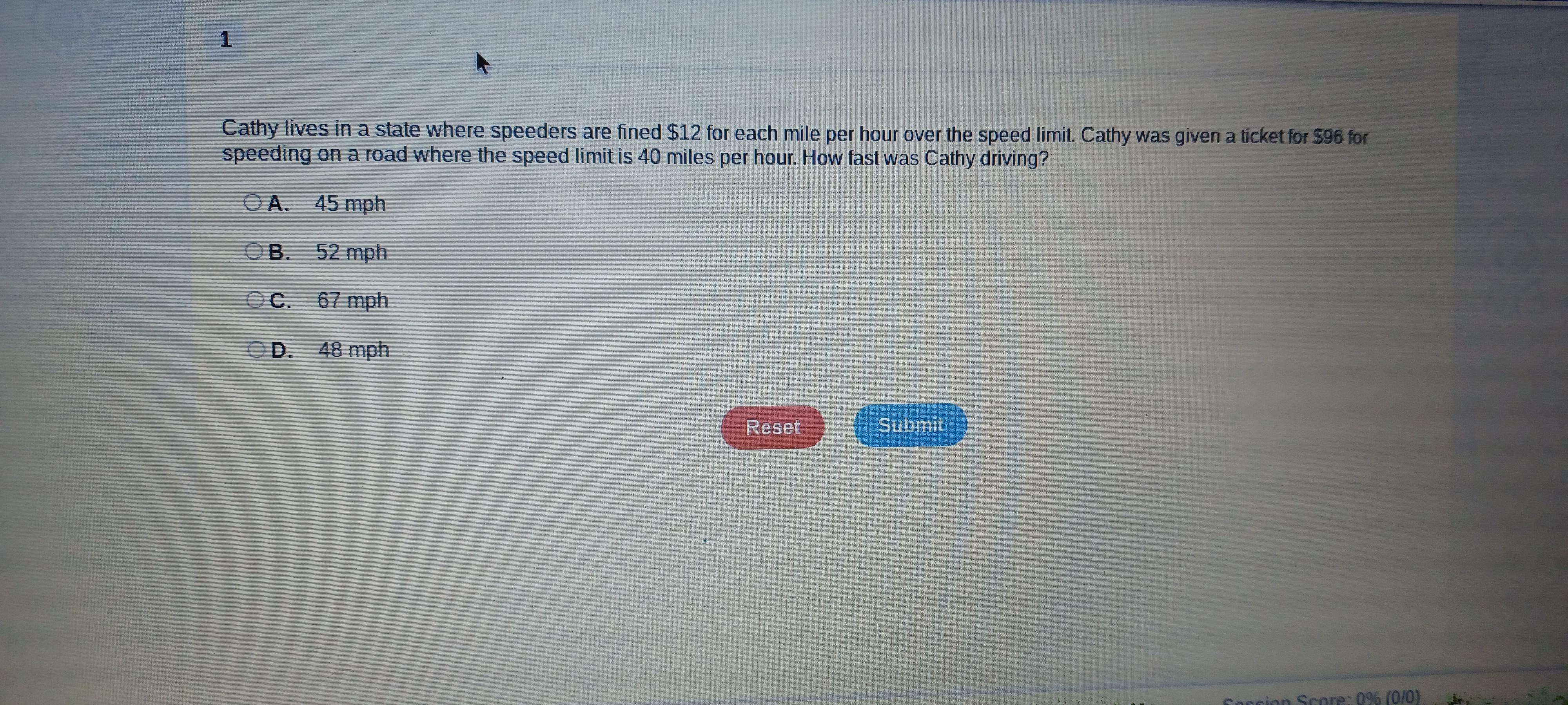 Since you get fined $12 for each mile per hour over and she was fined $96, we can set an equation to find how many miles per hour she was over: