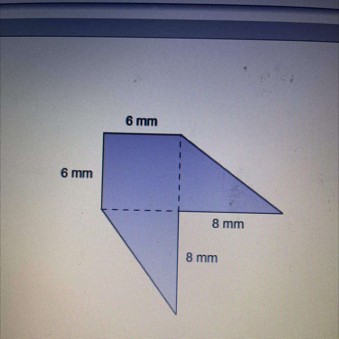 first do the square you see, 6 × 6 which is 36. then do one of the squares and the area is 8 × 6 which is 48 then divide that by 2. you will use the same equation for the other triangle, and the area for it should be the same. last add all of those together so 36 + 24 + 24 = 84 mm sq.