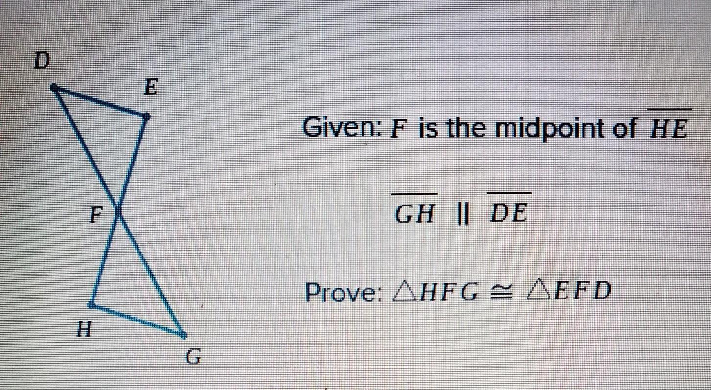 D Given: F is the midpoint of HE F GH I DE Prove: AHFG = AEFD H G Statement Reason