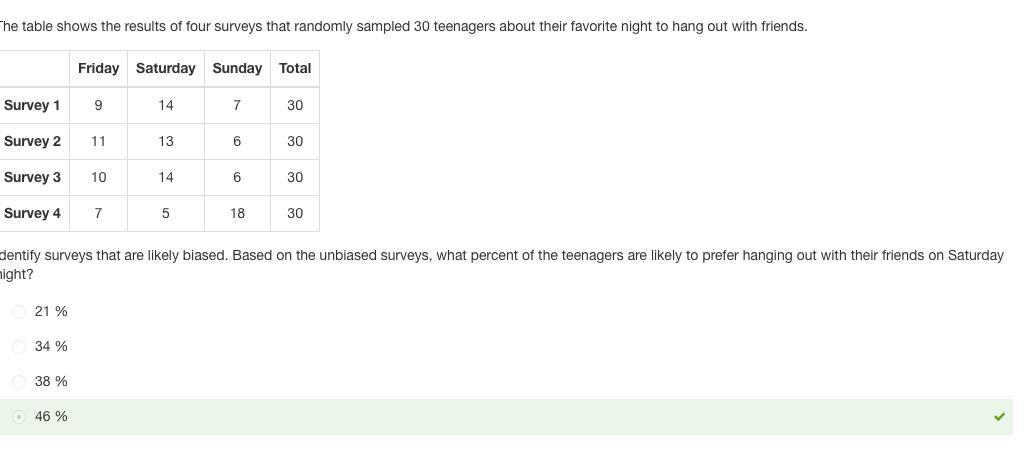 ds. Friday Saturday Sunday Total Survey 1 9 14 7 30 Survey 2 11 13 6 30 Survey 3 10 14 6 30 Survey 4 7 5 18 30 Identify surveys that are likely biased. Based on the unbiased surveys, what percent of the teenagers are likely to prefer hanging out with their friends on Saturday night? 21 % 34 % 38 % 46 %