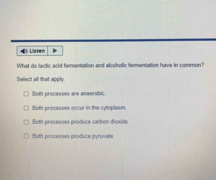 Both lactic acid and alcoholic fermentation are catabolic processes. Both lactic acid and alcoholic fermentation do not require oxygen. Both lactic acid and alcoholic fermentation occur in the cytosol.