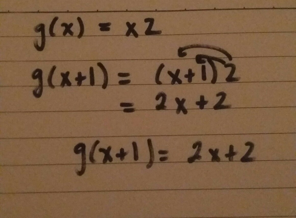 First you substitute x+1 for x because they want g (x+1) . Then you solve