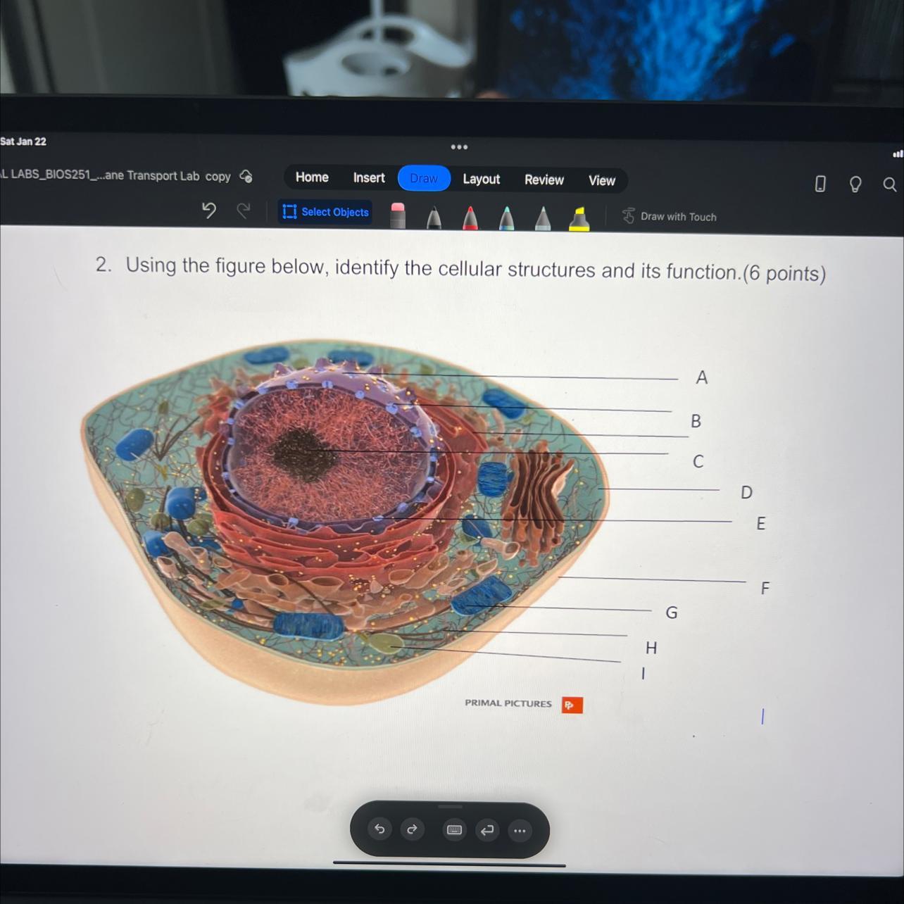 The cellular structures observed in the Figure include cell nucleus (A), nuclear pores (B), genetic material (C), cytoplasm (D), nuclear lamina (E), cell membrane (F), mitochondria (G), cytoskeleton (E) and lysosome (F).