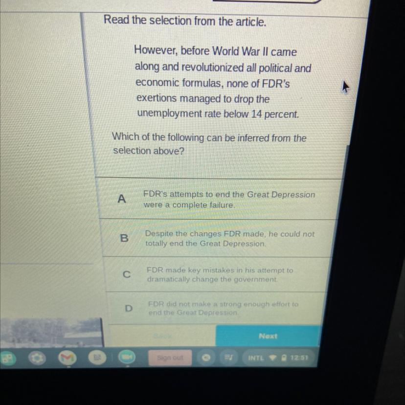 the answer is B. despite the changes that FDR made he could not totally end the Great Depression
