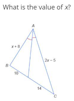-It is given in the picture that angle A is bisected so we can use the <u>angle bisector theorem</u> ( if a ray bisects an angle of a triangle then it divides the opposite side of the triangle into segments that are proportional to the other 2 sides)