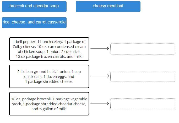1) 1 bell pepper, 1 bunch celery, 1 package of Colby cheese, 10-oz can be condensed cream of chicken soup, 1 onion, 2 cups of rice, 10-oz package frozen carrots, and milk = Rice, cheese and carrot casserole.