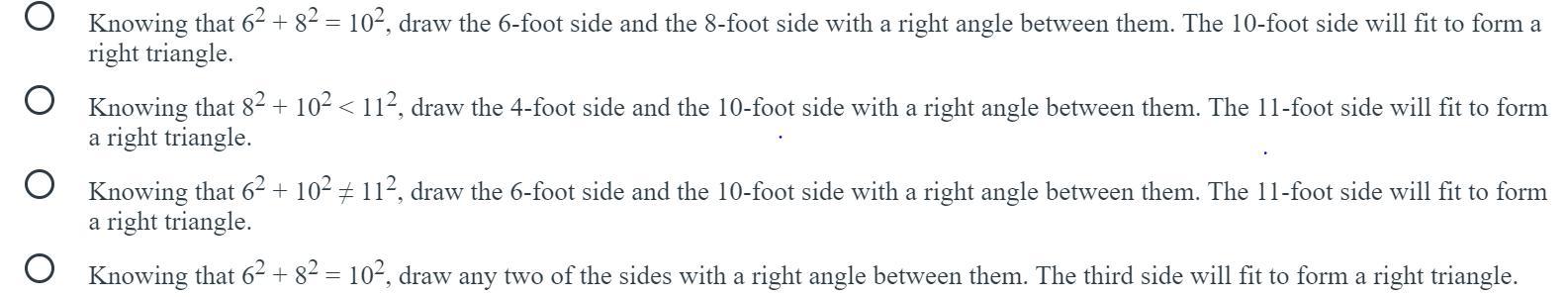 Therefore, a triangle with sides 6,8,10 is a right triangle. The hypotenuse 10 is the longest side opposite the 90 degree angle. In other words, the 90 degree angle is between the sides 6 ft and 8 ft.