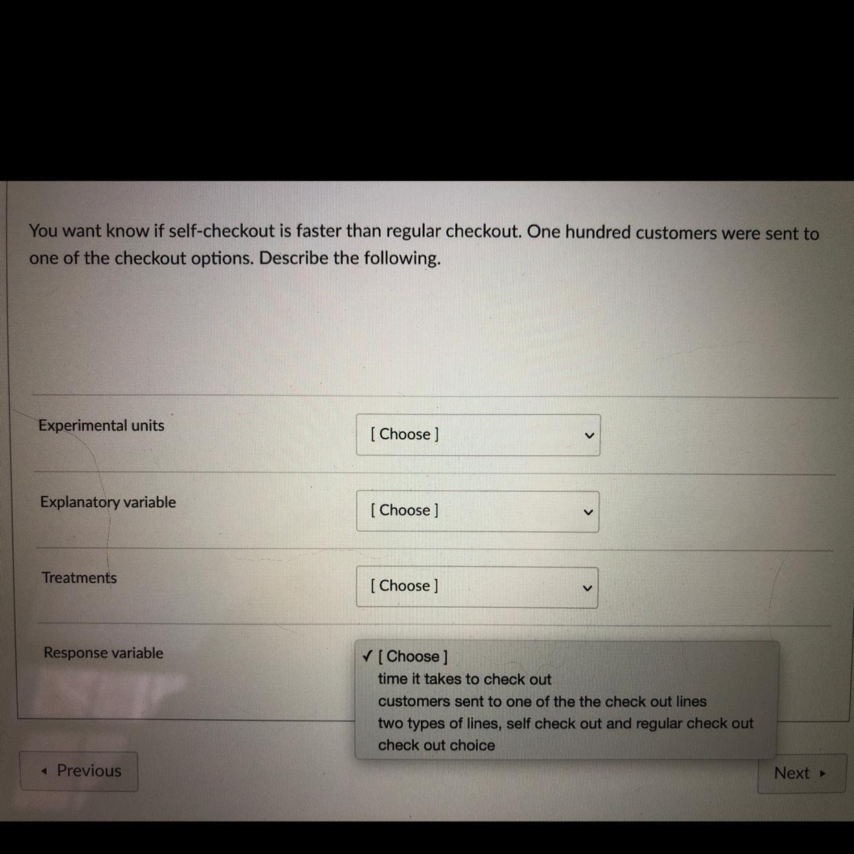 - <u>The response variable in the question is the times it takes to checkout</u>