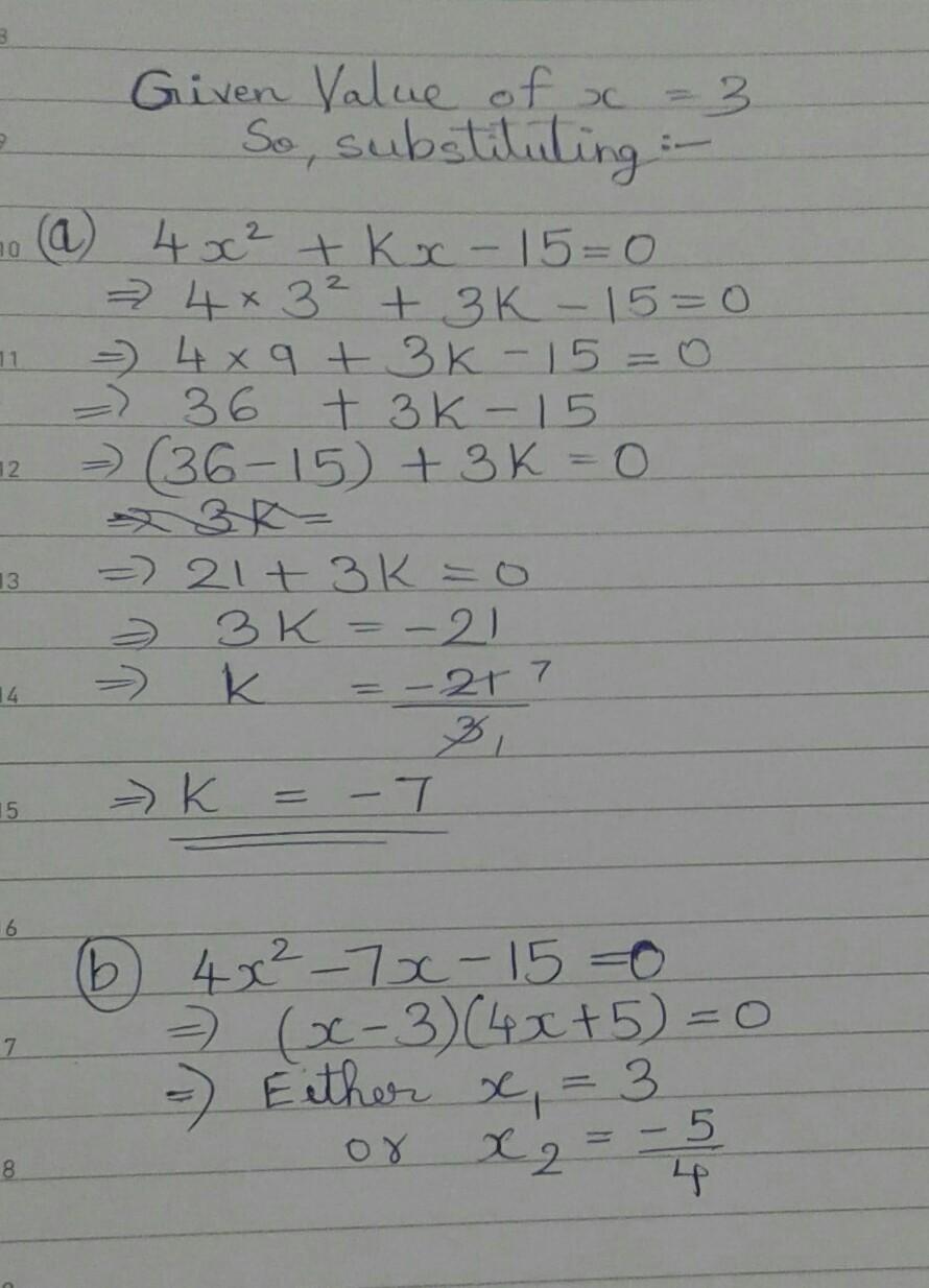 It is given that x=3 is a root of the equation 4x^2 + kx- 15 = 0 , where k is a constant.Find
