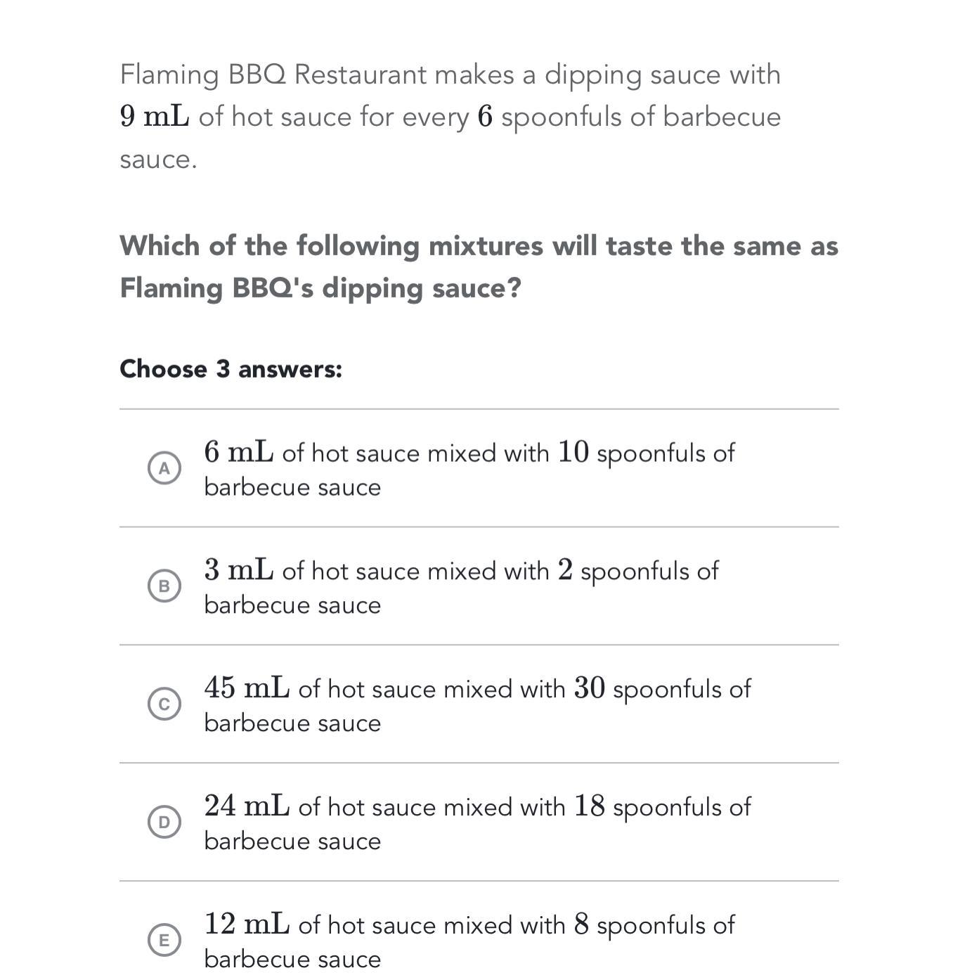 E. 12 mL to 8 spoonfuls: 12/8 = 3/2 (divide both terms by 4)