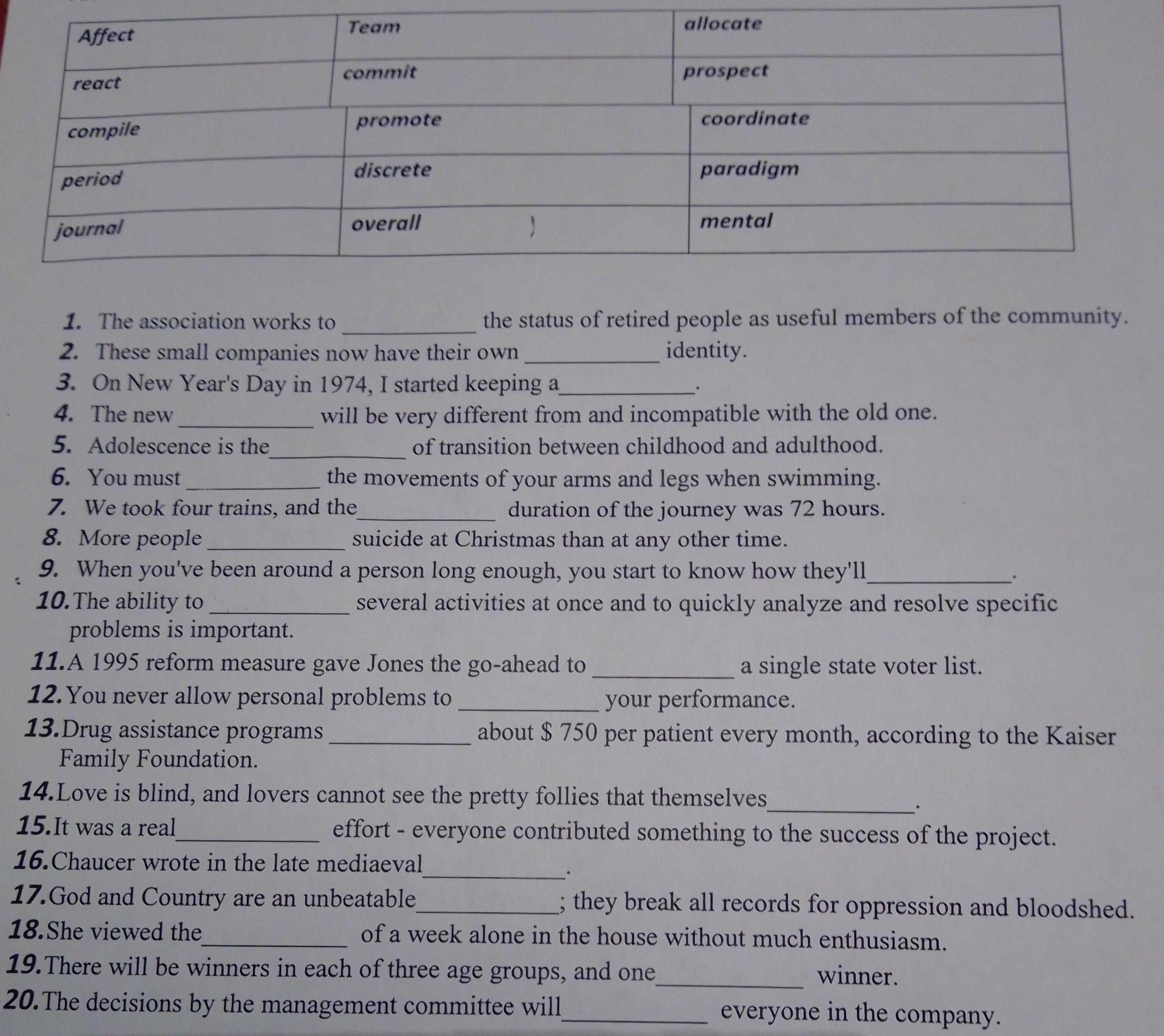 Number 3 is "journal". Number 16 is "period". Number 20 is "affect".