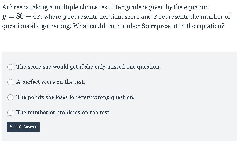 80 is the highest score you can get. the amount of questions she got wrong (x) is multiplied by 4 and subtracted from 80. Therefore, 80 is a perfect score.