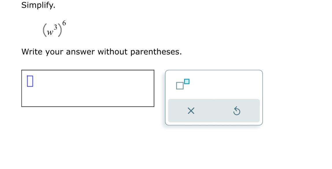 the "power to a power" rule allows you to multiply those two exponents. is the formula for this rule. in this question, x is w, a is 3, and b is 6. we can multiply the 3 and 6 and get 18 and keep the base the same.