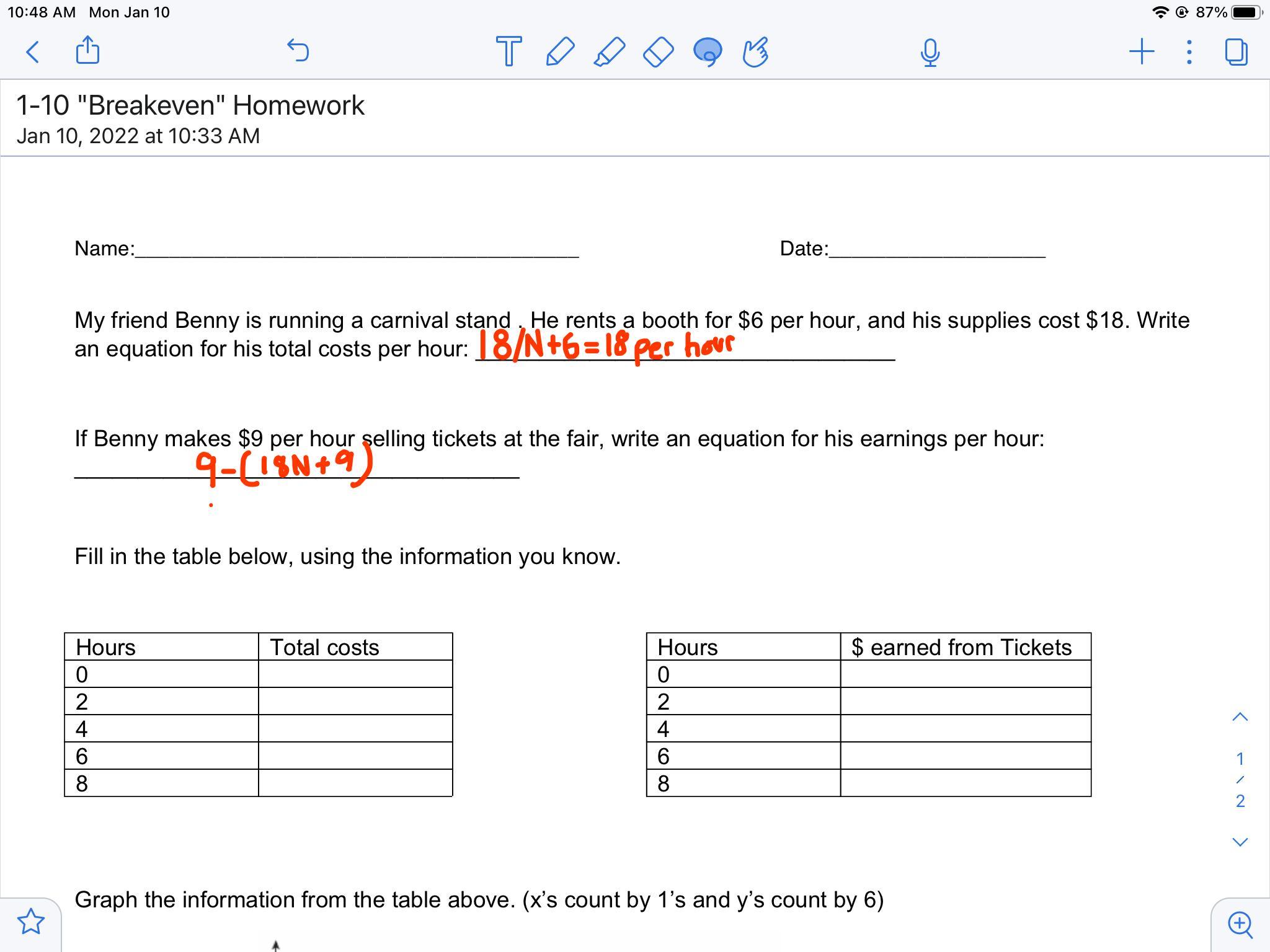 The breakeven point, when cost and earnings are equal, is at 6 hours, when both cost and earnings are $54. That is where the two lines intersect in the graph.