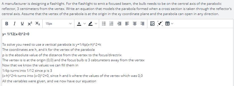 • \displaystyle The \ equation \ of \ the \ parabola \ that \ models \ the \ reflector \ is; \ \underline{ y = \frac{1}{12} \cdot x^2}