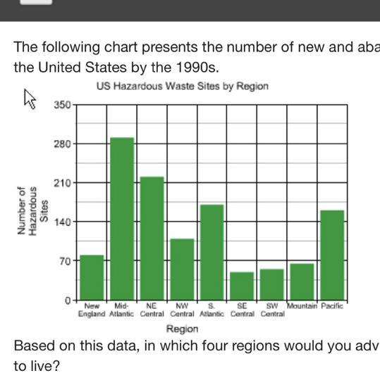 A bar graph titled U S Hazardous Waste Sites by Region has region on the x-axis, and number of hazardous sites on the y-axis, from 0 to 350 in increments of 70. New England, 75; Mid-Atlantic, 290; N E Central, 220; N W Central, 100; S Atlantic, 170; S E Central, 45; S W Central, 50; Mountain, 65; Pacific, 150.