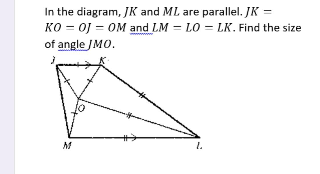 Since the sum of angle in the triangle JOM is 180 degrees, hence;