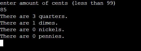 Console.WriteLine("enter amount of cents (less than 99)");
