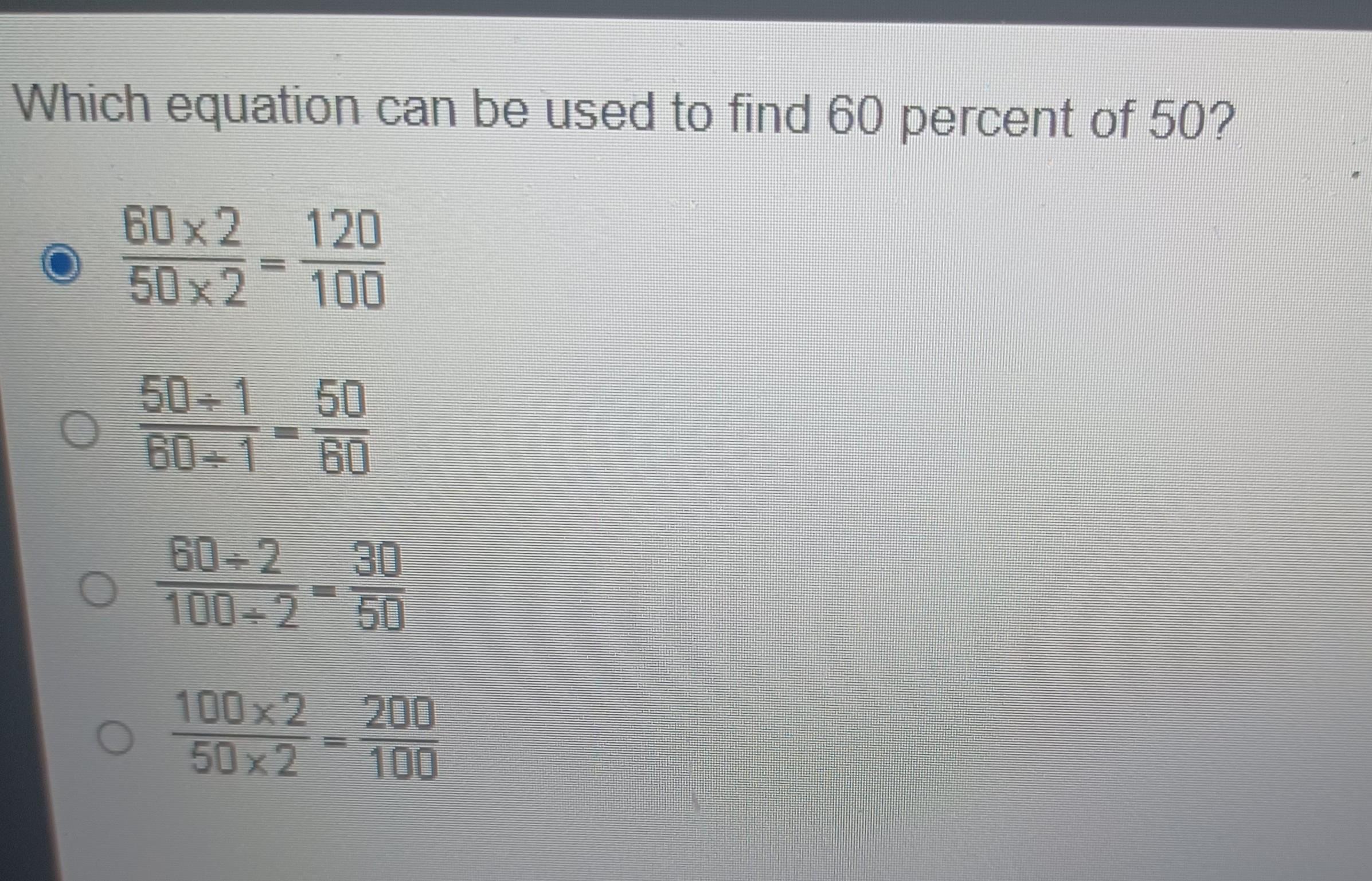 Which equation can be used to find 60 percent of 50