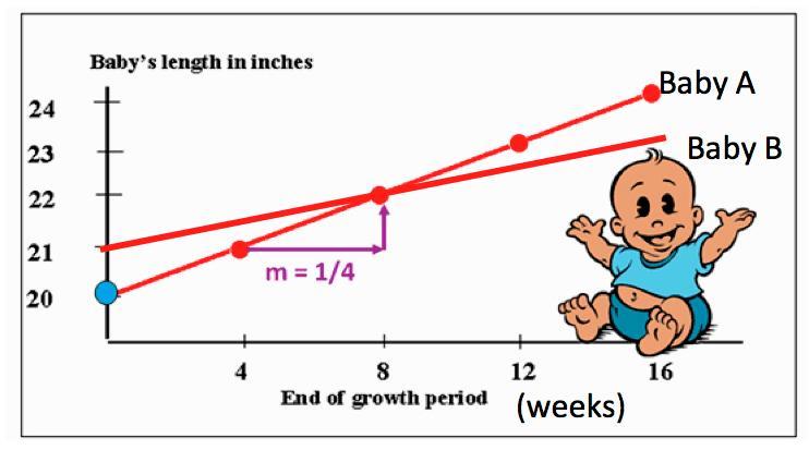 M = the slope. Baby A: To find the slope, randomly label two points on the graph. For this baby, you can use (4, 21) and and (12, 23). Label the first coordinate's numbers x1, y1. 4 = x1. 21 = y1. Label the second coordinate's numbers x2, y2. 12 = x2. 23 = y2. Once you have labeled your coordinates, you will find the slope. To do this, use the y2-y1/ x2 - x1 equation. Replace the letters with the labeled coordinates, and you have 23 - 21/ 12 - 4. That equals 2/8, which simplifies to 1/4. Now you know the slope for Baby A is 1/4. Replace the m in the equation y = mx + b with 1/4. ((And while the x right next to the m is not part of the slope, it is still part of the equation, so remember to keep it!!!))) Baby A: y = 1/4x + b. Baby B: For Baby B, you may think that you only have one dot, but look to the left side of the screen. You notice that the line touches the y-axis, which technically counts as another coordinate. So now you have two coordinates, (0, 21) and (8, 22). Label the first coordinate as x1, y1. Label the second coordinate as x2, y2. Then, use the y2-y1/ x2-x1 equation. Replace the letters with the numbers, and you get 22-21/ 8-0. That equals 1/8, so you know the slope for Baby B is 1/8. Replace the m with that number, and your new equation is y = 1/8x + b.