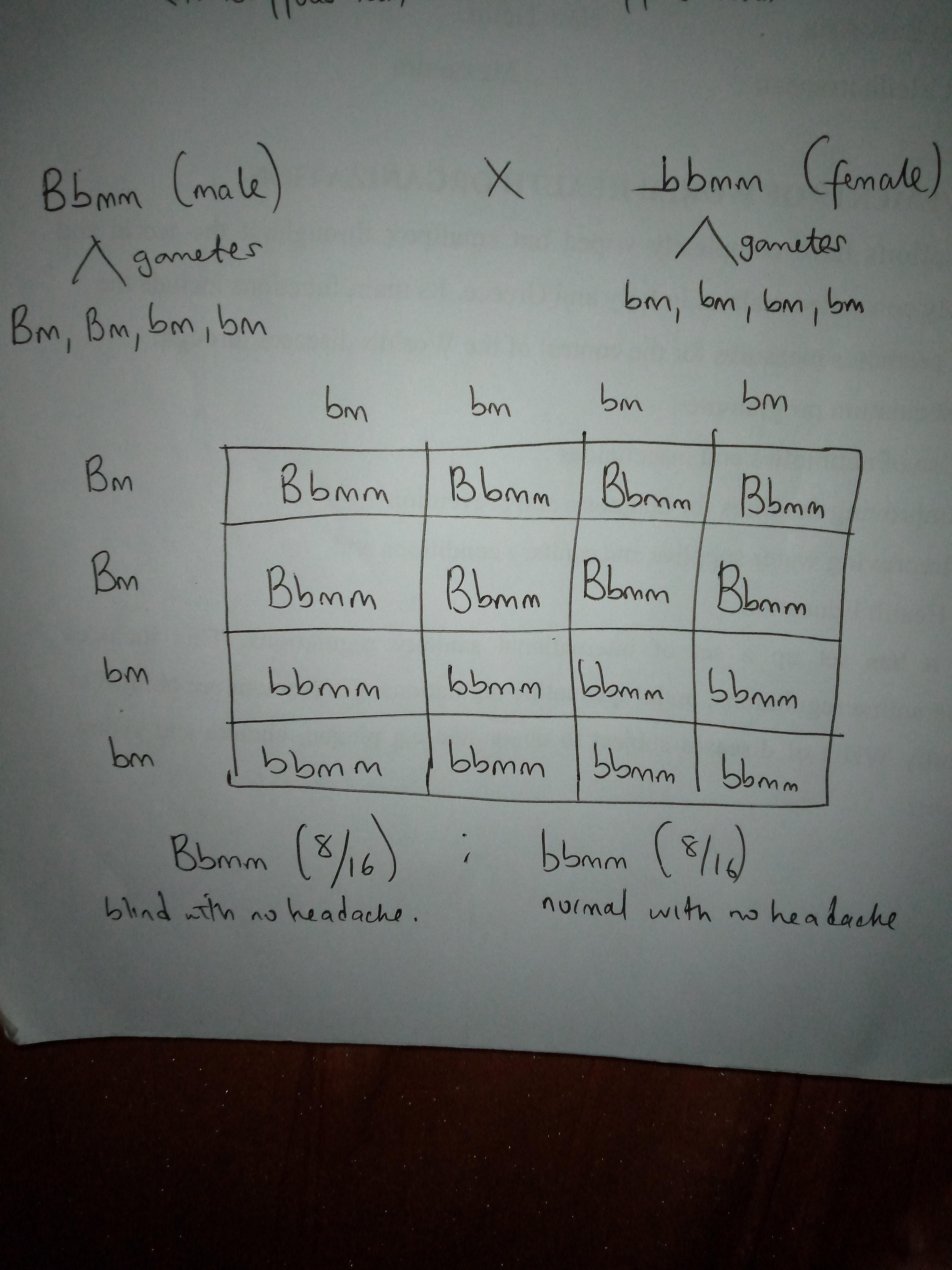 Hence, this cross can produce a child with normal vision who does not suffer from headaches (bbmm). Also, the probability of producing such child is 8/16 or 1/2.