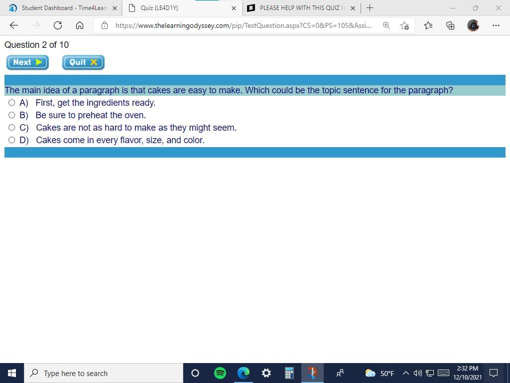 The question states that cakes are easy to make is the main idea. You need a topic sentence that will support that. The answer C. says, ""Cakes are not as hard to make as they might seem"" This answer helps state the main idea, cakes are easy to make.